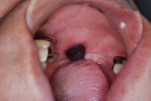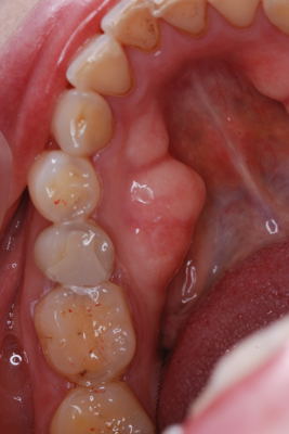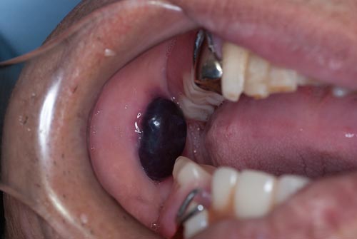 | 真ん中の赤い球状の物は、血腫です。いわゆる「血豆」ですが、口腔内にもできます。間違って頬粘膜を咬んだためにできたのですが、この様に歯と同じ位の大きさになる事があります。このままですとじゃまですし、さらに大きくなる可能性がありますので、切開して中の血液を排出させます。すぐにすっきりと楽になり、傷も数日で治ります。 | ![]() |