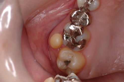 | これは、過剰歯です。おまけの様な小さい歯が余分にできる事があります。不思議ですね。 隣の歯にくっついている事もあり、別になっている事もあります。 |