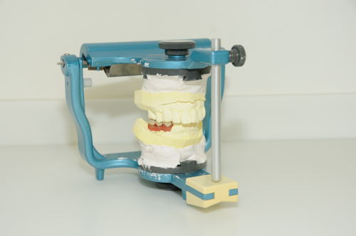 | 奥歯を作っている所です。この青い器械は「咬合器」という物で、下顎の動きを再現する事ができます。人間の下顎は単に開閉するだけではなくて、前方や側方にも動きます。それに合わせて咬みやすい歯を作るのです。 | ![]() |