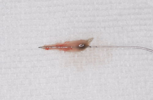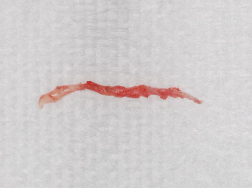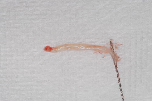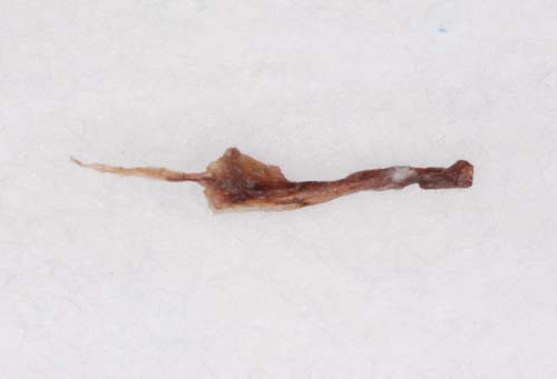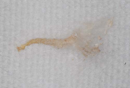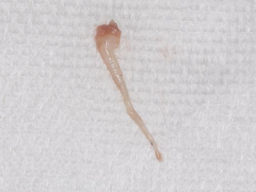 | 珍しい物をお見せしましょう。歯の中にある神経ですが、正式には歯髄といいます。虫歯がひどくて取らざるを得なかったものです。太いとこのようにきれいに取れるのですが、大体は細くてちぎれてしまいます。それを全て除去するのが大変。後で痛みや炎症の原因になっては困るので専用の器具を入れて全ての歯髄を丹念に除去するのです。神経を抜いた後に歯内の清掃に時間が掛かっている場合は、これがとても細くて取りづらいからなのです。 | ![]() |