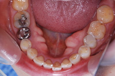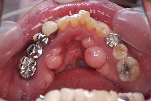 | 今回の写真は下顎隆起です。下顎骨の内側が写真の様に出っ張っています。症状はありません。これは、歯でも根でも無く骨なのです。腫瘍ではないかと心配して相談に来る方もいらっしゃいます。しかしただの骨の出っ張りで腫瘍などの悪い病気ではありません。原因は不明ですが小さい物を含めると結構な頻度で出現します。下顎の場合はこの場所で、上顎の場合は真ん中(口蓋中央部)に多いです。 | ![]() ![]() |