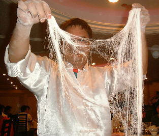 | 観光も終わってツアーの夕食。「潮州料理」をご賞味ってあるけど、潮州料理って何だ? ガイドブックによると、広東省東部潮州の料理で、広東料理よりも薄味で甘味があってまろやか。フカヒレとツバメの巣が高級食材として出される。。。 う〜ん、でも料理はフカヒレのカケラさえ出てこなかった。ただの中華料理だったけど、海鮮を炒めたものや、野菜はとても美味しかった。セロリとイカの炒めものは絶品。 横で職人さんが、「ドラゴン・キャンディー」なるものを作っていた。作る要領は、よくテレビで見る手打ちラーメンと一緒。飴を何度も伸ばし、折り曲げて、細く仕上げていく。龍の髭にたとえられるところから、「ドラゴン・キャンディー」と呼ばれるそうだ。そのまま口に入れると、飴が口の周りにくっついて、まるでヤギの髭だ。