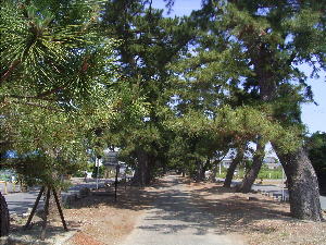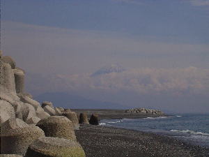 | 天気が良くて海岸からは富士山が遠くに見えました。 | 御穂神社へ続く松並木 |