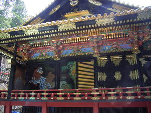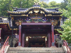 | 唐門 本殿に続く豪華な門。重要文化財に指定されている。分厚い総漆塗りに豪華な金細工や彫刻、飾られている。でもたった1年7ヶ月で完成したそうだ。 |