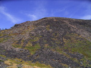 | ロープウェイで1600mまで上がり、登山開始!すぐに、姿見池と活発にガスを噴上げる様子が見える | 森林限界を超えているので、登山道は同じ岩だらけ。急な登りを進んで頂上まであと少し。 |