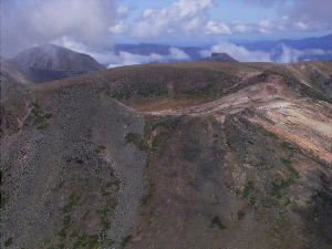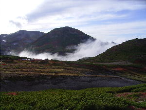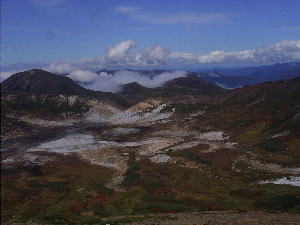 | 旭岳の急な下りを進んで振返って旭岳を見る。途中大きな雪渓があったよ。 | 有毒温泉とお鉢平の前景 北海岳分岐点手前で見えてきた。紅葉も始まっています。 |