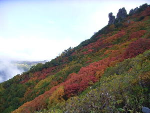 | 黒岳頂上。全く霧で周りが見えない。頂上にはシマリスが住んでいて、足元近くにも寄ってきた。すばしっこくて写真は撮れなかった。 | 黒岳から層雲峡側に下山します。黒岳側の方が紅葉が進んでいました。霧の晴れ間から、見えてきました。 |