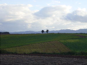 | 美瑛の丘、遠くに見えるのは親子の木 3本の木が仲良く並んでいます。 |