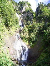| 天人峡にある羽衣の滝。天女の羽衣伝説にちなんだ名所が残っている。奥にある敷島の滝は途中通行止めで行けなかった。 |