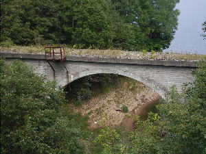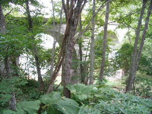 | 国道沿いの橋を探索。木や草が生い茂り、これ以上は近づけない。 | 国道の橋の上から見ることができました。奥は糠平湖です。 |