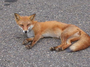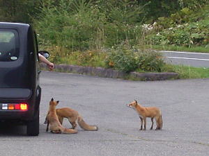 | 然別湖を通り、十勝平野が見渡せる展望台になっている。眺めはいまいちだったが、なんとキタキツネが数頭集まっている。人馴れしてエサをねだる。 | こいつは堂々としていて、駐車場の真中に寝っころがっている。おーい!って呼んだら、振り向いた! |