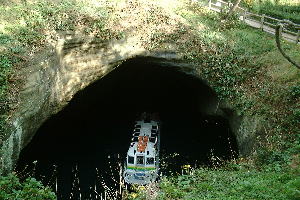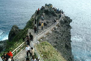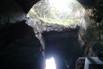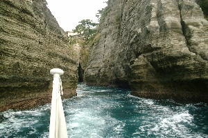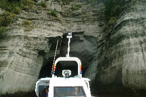 | 観光船に乗って出発!急に向きを変え、岩の裂け目にさしかかって来た。 | 洞くつの入り口が見えてきた。中はどんな様子か、ワクワク。 |