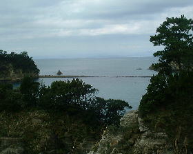 | 象島、中ノ島、高島の三つの島総称だそうだが、引き潮になると、手前の象島と陸続きになる。トンボロ現象というそうだ。帰って来れなくなるといけないので、眺めただけ。 |