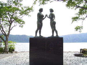 | 十和田湖遊覧船に乗ってゆっくり湖を眺めます。奥入瀬は明日行くことにして、周遊コースを選びました。 | 十和田湖のシンボル「乙女の像」 高村光太郎最後の作品、モデルは愛妻の智恵子夫人だそうだ。 |