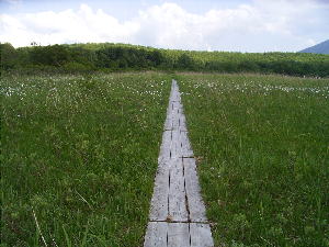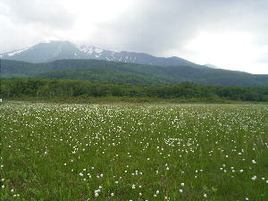 | 八甲田山の北東側に位置する湿原。一周約1時間ぐらいのハイキングコースになっています。 | 白いのは「わたすげ」の群生。他にもレンゲツツジやニッコウキスゲなども見ることができました。 |