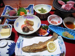 | 前日に予約を取った温泉旅館。家庭的で料理も美味しかった。岩魚の唐揚は揚げたてでした♪ |