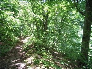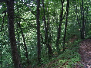 | 帰りは、ブナ林散策歩道を通って戻ってきました。林の中は日光が遮られ、シダ植物が生茂っています。 | |