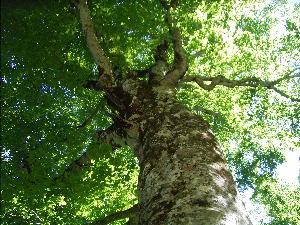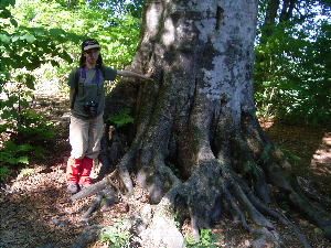 | ひときわ大きな樹、マザーツリーだ。見上げると、大きい!「お母さ〜ん」って感じ? | 樹の幹もこんなにもりっぱ。他にもこの辺りには、ブナの巨木がいっぱいだ。 |