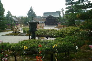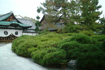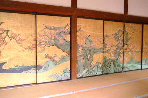 | 正面は唐門、前庭は白砂を敷詰め、宸殿、正寝殿、御影堂などの建物が回廊で結んでいます。 | 狩野山楽の「紅白梅図」ちょっとピンぼけだが、鮮やかだったのは模写。本物は宝物館にあった。 |