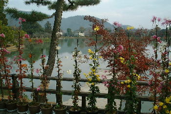 | 観月台から見た大沢の池 大覚寺の東側に位置する大沢の池は、嵯峨天皇が離宮造営の際、中国の洞庭湖を模して築造されたという。ここからの眺めは、私の好きな場所。手前は、展示中の嵯峨菊。 |