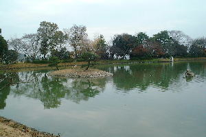 | 大沢の池に浮かぶ菊ヶ島 嵯峨天皇が、菊ヶ島に自生した野菊を手折られ、いけられたのが「天、地、人」の三才に適し、今後の範とされたのが、いけばなのはじまりだそうだ。気品さがさらに洗礼され、嵯峨菊と呼ばれています。 |