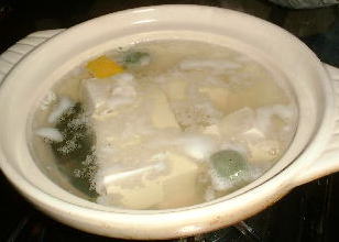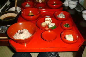 | 大覚寺から天龍寺に向かう途中、清涼寺で湯豆腐をいただきました。お寺なのか精進懐石で、てんぷらとデザートに黒ごまが付きます。どれも上品で美味しかったです。 | 出ました、湯豆腐♪お寺の隣にある森嘉のお豆腐を使っています。でも一人6個。物足りないので、豆腐を買って帰りました。湯豆腐は、おまかせのみ3,500円 |