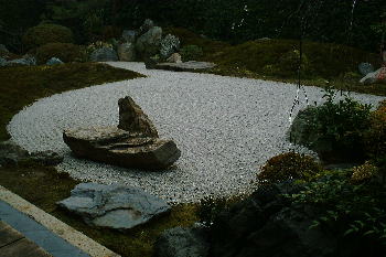 | 庭園には巨石が配され、これは獅子岩。なるほど、ライオンの横顔に似ていないことも・・・・ 宝厳院の庭園は「獅子吼の庭」と呼ばれ、獅子吼とは「仏が説法する」という意味だそうだ。 |