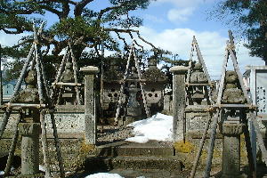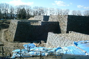 | 霞城公園に建つ最上義光の像。仙台の伊達正宗像に劣らず立派です。公園近くの最上義光歴史館は、義光が可愛がっていた次女駒姫(秀次の側室で三条河原で処刑)の資料もありお奨めです。 | 山形城一文字門の復元現場 山形城、前回来たときは何もなかったのに、こんなものを造っていました。 |