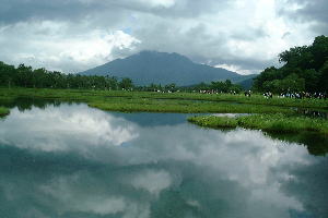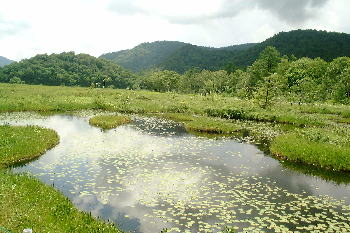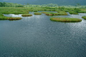 | 梅雨の季節、湿原はところどころ水をたたえ、池が点在する。 |