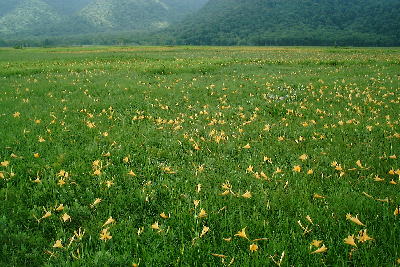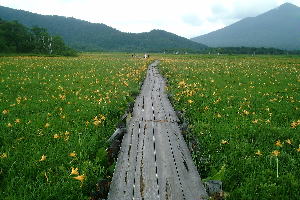 | 三叉路をヨッピ吊橋方面に向かう。一面ニッコウキスゲのお花畑 |