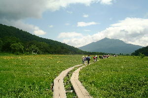 | 出発地の鳩待峠から、1時間ほどなだらかな下り道。尾瀬ヶ原に着いたよ。ニッコウキスゲは今が見頃。 正面に見える山は、尾瀬のシンボル燧ケ岳(ひうちがたけ) |