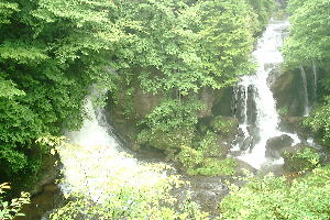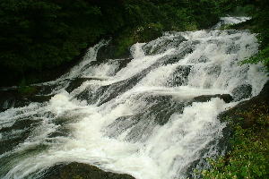 | 滝壷付近。二つに分かれる滝が竜の頭に似ているところからか。 | 遊歩道を進む、滝の中流付近。流れが間近に見れて、一番の迫力 | 滝の上流 |