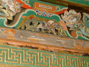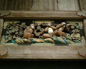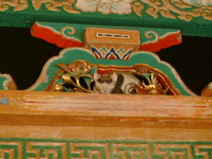 | 左甚五郎作の彫刻を見るのも、東照宮観光の楽しみ。ご存知、三猿。聞かざる、言わざる、見ざる。 | 一番有名な「眠り猫」。とっても小さな彫刻でした。かわいい。 | 眠り猫の裏側にある雀。猫の近くでも雀が遊べるという安定した世を表したものとか。 |