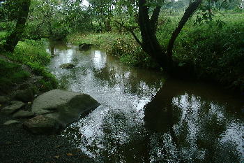 | 常堅寺のすぐ裏には、カッパが住んだと言われるカッパ淵があります。この先は田んぼに水を引く用水路になっているが、ここは某テレビ局の番組でカッパ騒動を起こしたところです。 |
