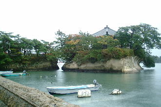 | 松島のシンボル的な存在。朱塗りの橋を渡っていきます。中のお堂に、五大明王像が安置されてからこの名がついたそうです。 |