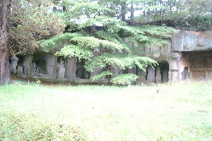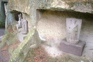 | 修行した場所と思われる小窟の跡がいくつかあって、中に石柱や石仏、五輪塔などが見えます。 | 島内には無名の石仏や石碑が数多く点在していますが、日本最古の石碑の一つ「頼賢の碑」などがあります。 |