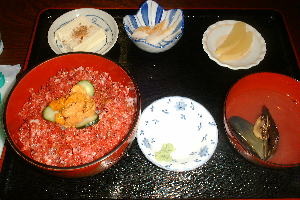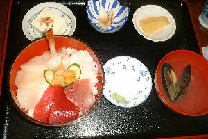 | ↑konkoが注文した「まぐろの目玉肉とウニ丼」ネギトロ丼みたいでしたが、しつこくない(1,500円) | ↑友人二人が注文した海鮮丼。生の大きなエビが美味しかったって。(1,500円) |