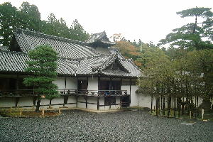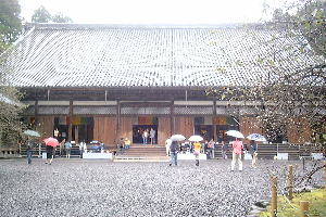 | 国宝の方丈。2001年春に来た時は、左右紅白の梅の古木がとてもきれいでした。 | こちらも国宝に指定されている回廊と庫裏(奥の建物) |
