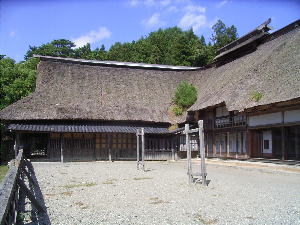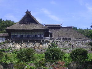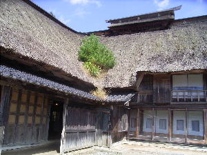 | 高台にあるとっても大きな茅葺の旧家。びっくり! | 曲り家の所以はL字の建物構造。左側が馬小屋 | 曲がり部分を拡大。右側が母屋 |