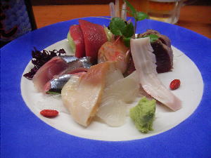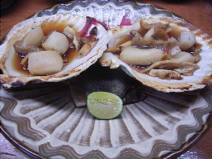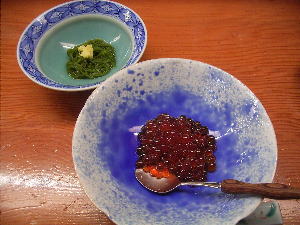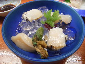| めかぶといくら | 刺身の盛り合わせ。かつおが一番気に入った。 | 鮑とホタテの刺身も出た |
