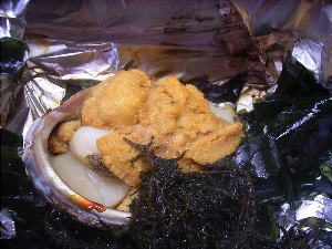 | ホタテと松茸の焼き物 | 雲丹とホタテの蒸し焼き。海藻添え |