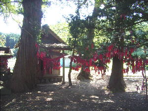 | 卯子酉様(うねどりさま) 恋愛の神様で、赤い布を左手だけで木に結べると恋人と結ばれるとか。境内には赤い布がいっぱい |