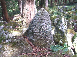 五百羅漢 岩がゴロゴロしたところだなと思っていると、なんと岩にお顔が。。。ほとんど苔むして写真ではわかりにくい。 |