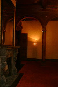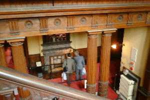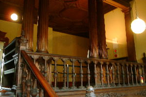| 階段踊り場 室内はジャコビアン様式で、木目の柱や天井が重厚かつ居心地の良く感じられます。 |