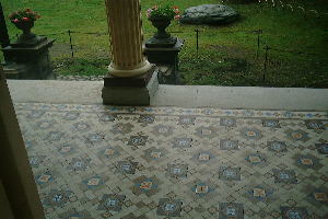 | かつては食堂で、ここで晩餐会をもよおした。右の扉が厨房につながっていた。その横にはかつて食器棚が置かれていたそうだ。 | 食堂の外はベランダにつながっていて、床には「サラセン風」のタイルが敷詰められている。きれい! |
