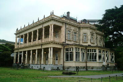 | 塀に囲まれた坂道を登っていくと、木々の間から豪奢な西洋館が見えてきました。17世紀英国ジャコビアン様式にルネサンス、サラセン、カントリーハウスの様式も取り入れ、和館もすぐ隣に併設している。 |
