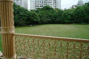 | 2Fのベランダからは、広々とした芝生の庭園が見渡せます。 | 2F客室。どの部屋も壁紙を変えて、暖炉を備えています。まるで外国のお城のよう | 水洗トイレ 様式は現在と一緒とか。「ロイヤル・ドルトン」社製 |