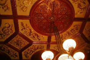 ←1F客室天井 シルクのペルシャ刺繍が布張りになっています。この部屋は、ペルシャ風でした。 |
