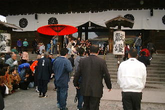 | 浄土宗大本願上人様のお数珠頂戴 天台宗と浄土宗の住職が二人いて、浄土宗の上人様は女性だ。住職それぞれ朝本堂法要のため出仕される時に、参道でひざまづく信徒を一人一人数珠で撫でて、高徳を授けるのが「お数珠頂戴」。朝早くから上人様を待つ信徒や観光客でいっぱい。私達も山門前で上人様を待機。キリちゃんも私も撫でてもらった。赤い傘の下に上人様がいらっしゃる。 |
