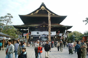 国宝 善光寺本堂 本堂の前にある木の柱が「回向柱」と言って、本堂の前立御本尊、中尊阿弥陀如来の右手と柱がヒモで繋がっていて、回向柱をさわることによって、御本尊様とご縁が結ばれる。 柱に触って、本堂で前立御本尊を拝観する。ちょうど先ほどの上人様の朝の法要の最中で、最後に上人様はくるっと我々参拝者の方を向き、大きな声で「南無阿弥陀仏」と10回唱えた。ありがたや、さすが宗派に関係無く親しまれている要素がいっぱいですね。 その後戒壇めぐり、経堂などを見て、旅館に戻る。朝食後、御印文頂戴を受けに再び善光寺に行くと、回向柱には長蛇の列だった。 |